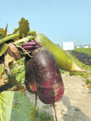 在礼贤镇的这处蔬菜基地中,不仅有老口味蔬菜,也有一些优质的外来引进的新品种。如贝蒂迷你大白菜,一颗重量仅2斤左右,菜叶更柔嫩,开锅软烂,深得种植户和市场的青睐;新品种紫霞冰淇淋萝卜,有着独特的紫红色的外观、脆而致密的口感,吃起来甜脆甜脆的,像水果一样。