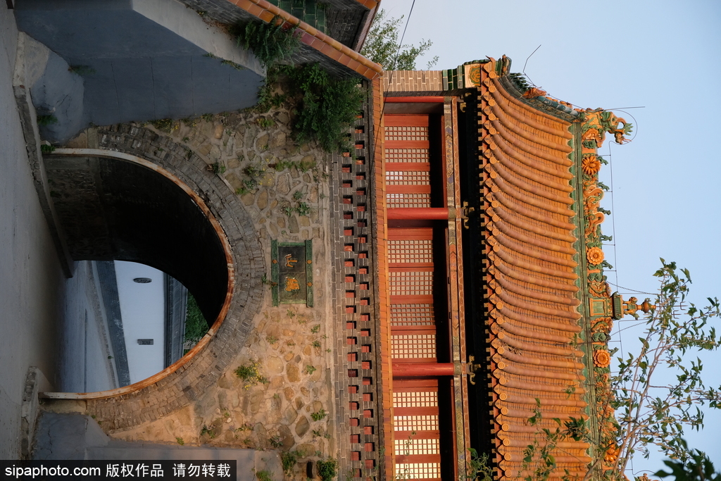 三官阁过街楼高10余米,建于清乾隆时期,既有着门楼的作用,同时也是祈福的建筑。“阁楼顶上有琉璃制作的宝瓶,上边还有三叉戟,寓意是平平安安、官运亨通。”
