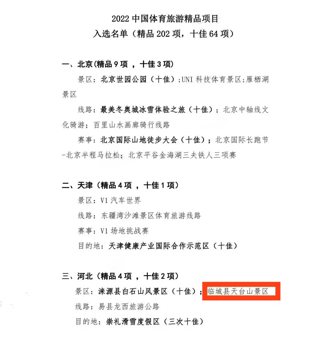河北新闻网讯(通讯员 张华芳)近日,国家体育总局体育文化发展中心公布“2022中国体育旅游精品项目”,河北省4个项目入选,邢台市临城县天台山景区名列其中。