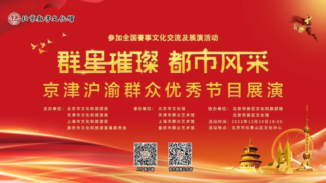 由北京市文化和旅游局、上海市文化和旅游局、天津市文化和旅游局、重庆市文化和旅游发展委员会主办,北京市文化馆、上海市群众艺术馆、天津市群众艺术馆、重庆市群众艺术馆承办,北京市各区文化和旅游局、文化馆协办的参加全国赛事文化交流及展演活动暨“群星璀璨 都市风采”京津沪渝群众优秀节目展演活动将于2022年12月10日在线上开演!