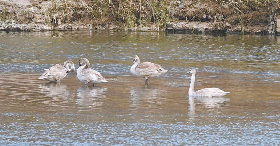 温榆河沙子营闸到下辛堡段的河面上,鸟儿们戏水的热闹景象为肃杀的冬日增添了一抹灵动和生机。“快看,是不是天鹅?”鸟类专家吴岚发现,主河道宽阔的水面上,一只灰色鸟儿正在游弋凫水。观鸟镜头里,鸟儿脖颈细长、体态优雅,身上白色羽毛里夹杂了些许灰色。它身后不远处的河畔浅滩,还有四只样貌相似的鸟儿,时而埋头梳理羽毛,时而舒展翅膀,时而又排成“一”字去河里游泳觅食……