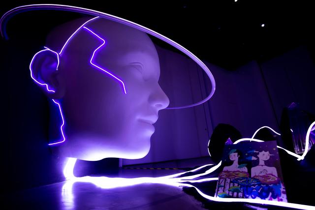 步入展厅,数名舞动的人物形象映入观众眼帘,他们的造型融合了众多科幻元素,是艺术家田晓磊创作的“人机结合生命体”。艺术家共创作了70个不同形象,并将他们分为不同的族群和分支。艺术家邓悦君的《漫衍》由10个发光运动装置组成,形态像是植物与昆虫的结合,装置顶部的光线忽明忽暗,其变换的节奏是由虫鸣声、乐器演奏声等转化而成,艺术家希望以此探讨能量转换的新可能。