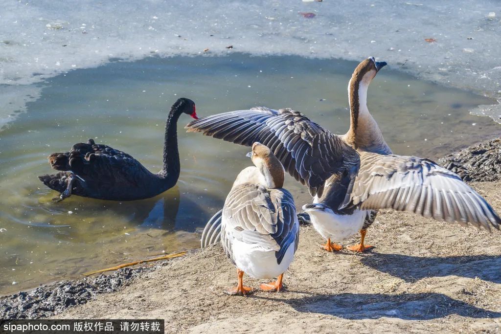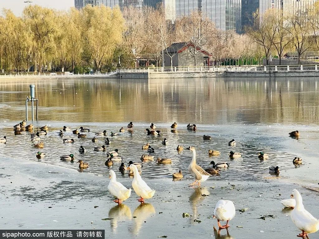 野鸭戏水、喜鹊登枝,虽然已是冬天,莲花池公园内却生机盎然、其乐融融。