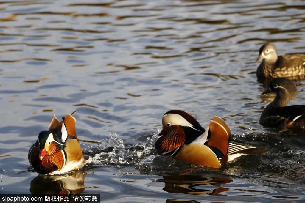 冬日的玉渊潭公园,湖光倒影间,尽显一片宁静祥和的景象,摇曳的芦花装扮着冬日的公园,鸳鸯成双成对地在湖面上游水嬉戏,成为冬天里一道充满活力的风景。