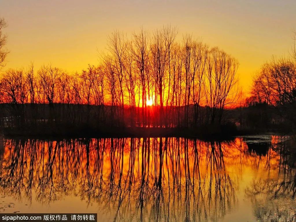 夕阳透过树枝,映射在湖面上,美得好似一幅油画。