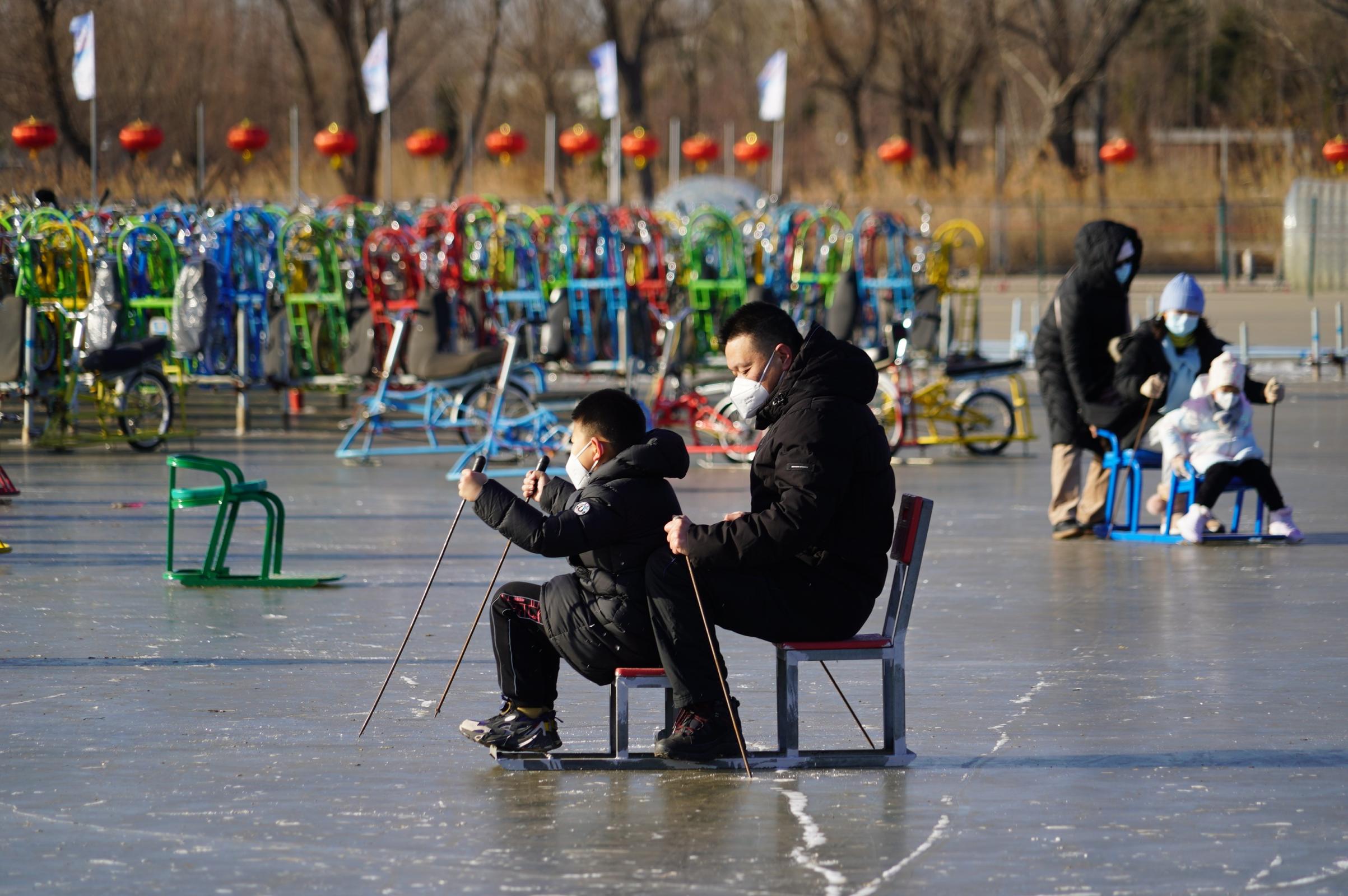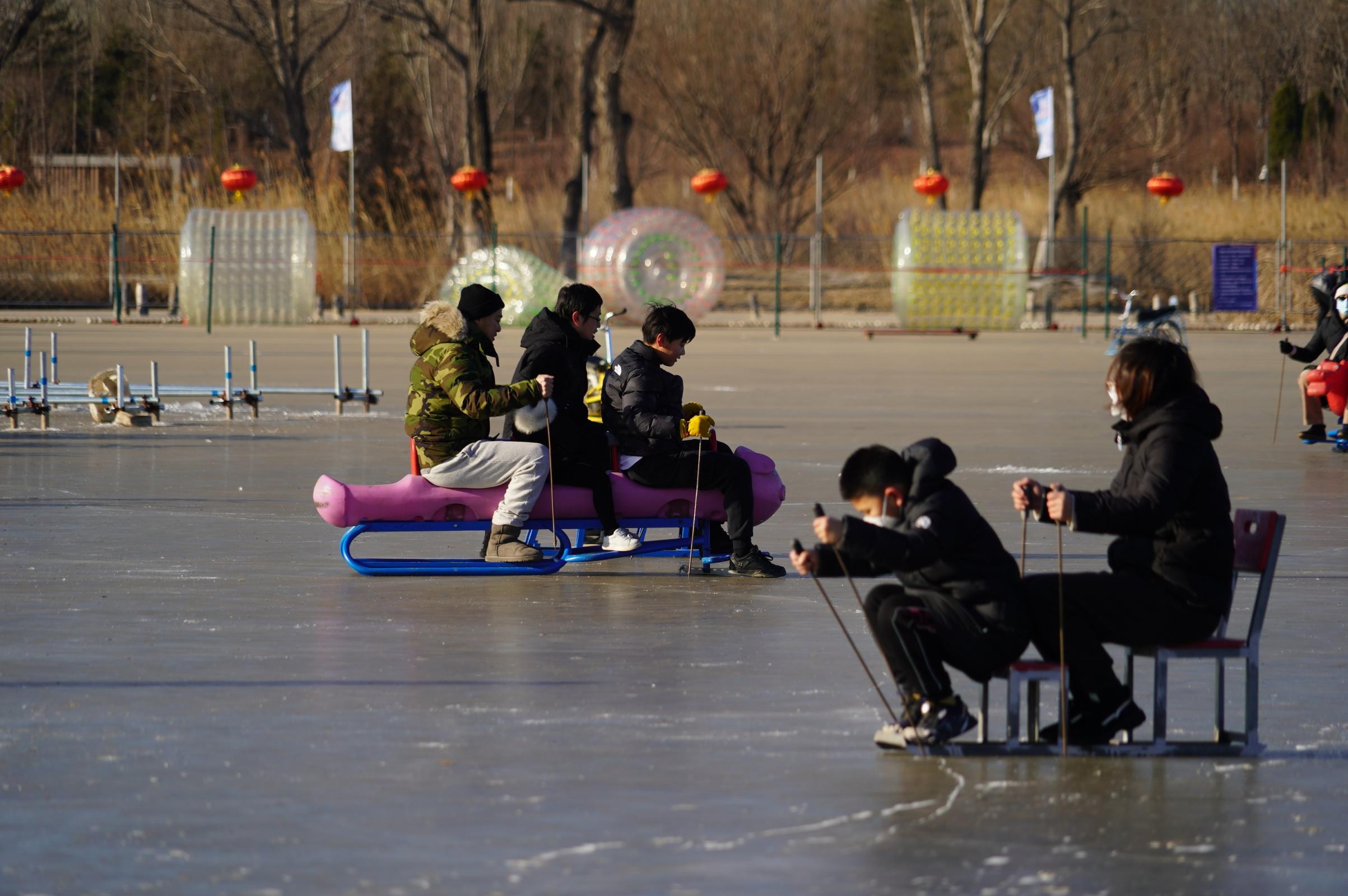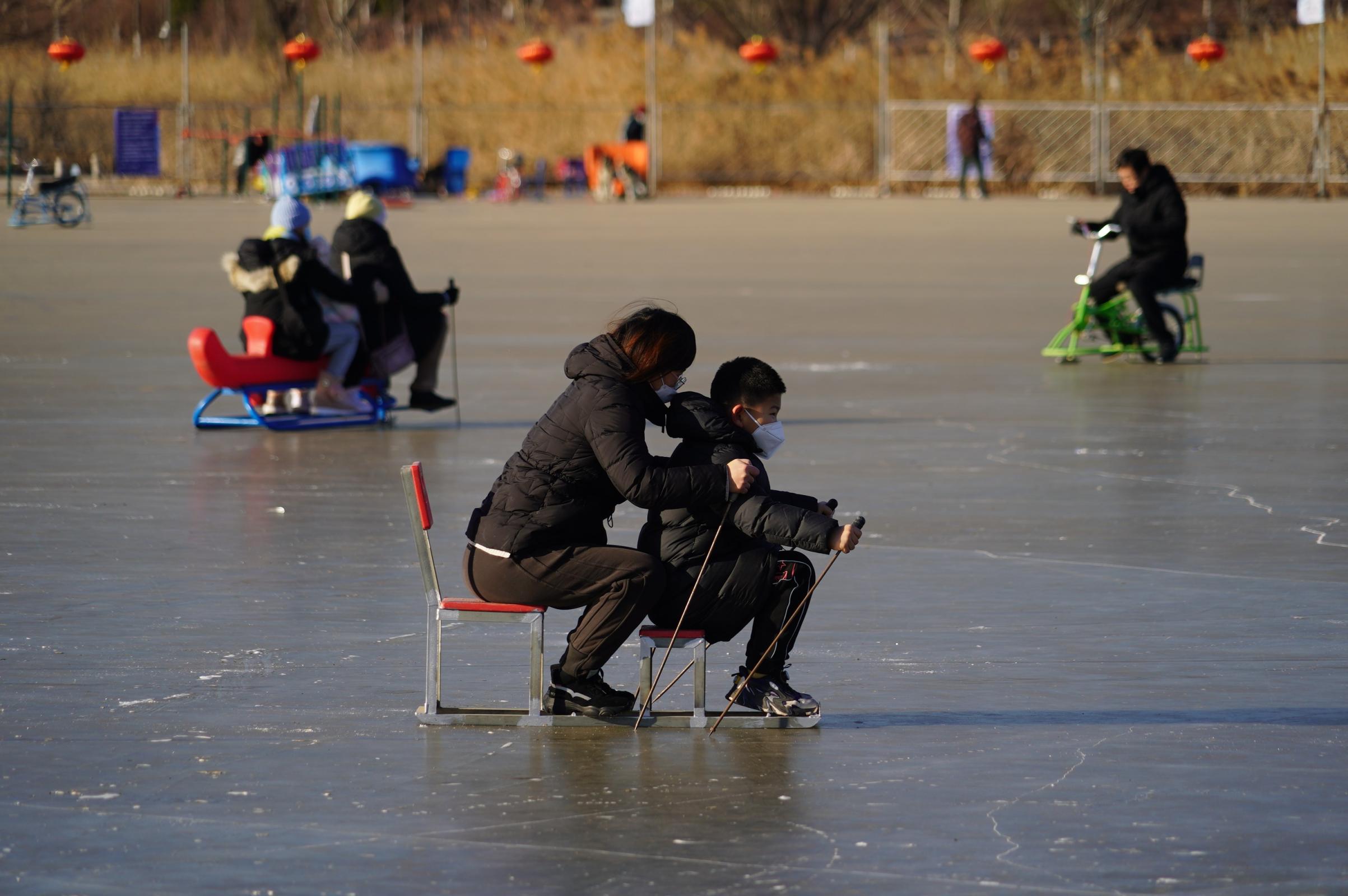 “我父亲年轻时特爱滑冰,今天我们一大家子都来了,陪他重新体验当年的爱好。”市民王女士说,跟室内冰场相比,天然冰场更有野趣,“今天孩子也特别高兴,一直跟着姥爷学滑冰,摔了跤也不怕。”