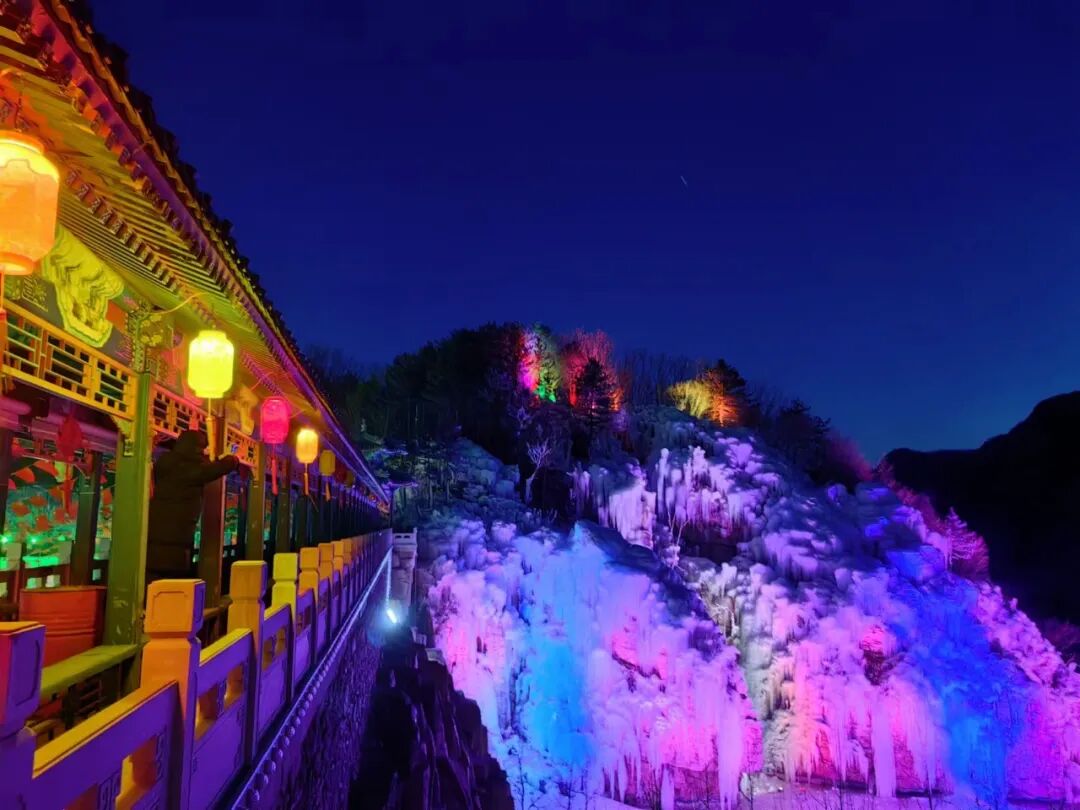 到了晚上,这些原本晶莹剔透的冰挂在灯光的映射下变得流光溢彩,美不胜收,把梨树沟装点得如同冬日仙境。