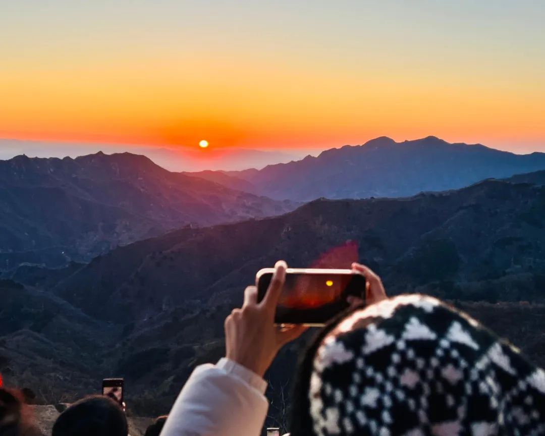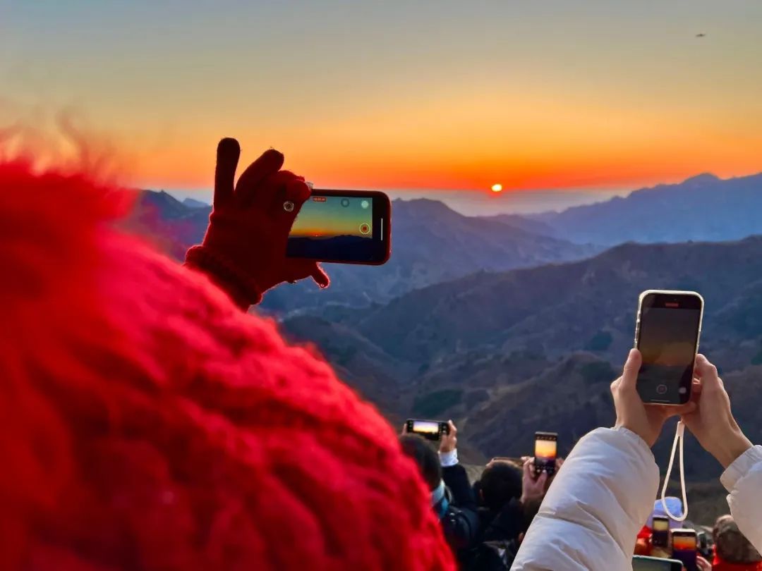 7点35分左右 ,满天红云,满山金波,游客们纷纷举起手机记录下这美丽而又激动人心的时刻,将2023年清晨的快乐记忆永久定格。美丽的长城在新年朝阳的眷顾下愈发壮阔,愿新的一年如这宏伟的日出一样,旭日东升,前兔似锦。