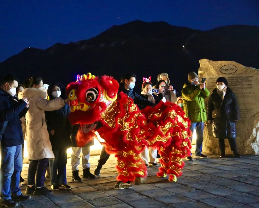 游客们在通过扫码登记后进入景区,全程佩戴口罩,做好保暖措施。长城上喜庆氛围浓厚,城墙间不时能看到提灯漫游的身影,舞龙舞狮激情澎湃的跃起,游客间拍照合影,在长城上留下新年的足迹,为长城带来了阵阵欢声笑语。