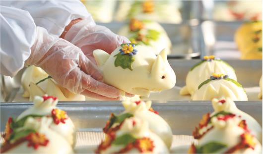 1月4日,邹平市韩店镇花馍面点师傅在摆放制作好的“发财兔”花馍。