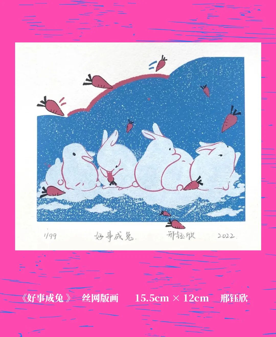 早在汉代,人们就通过木版画的方式制作出民间年画,用在春节期间装饰环境、趋吉避凶、寄托希望。时至今日,版画的发展日趋多元化,年画所表达的主题也愈加丰富多彩,而十二生肖作为独具中国精神和中国智慧的文化资源,成为了当代版画艺术家们用来创作的重要母题。生肖兔,作为吉祥、智慧和谨慎的象征,在今年更是备受青睐。
