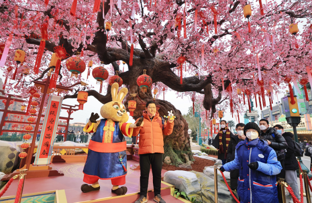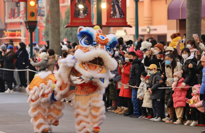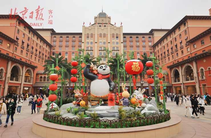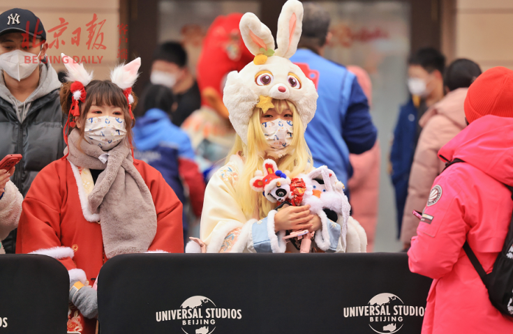 记者在现场看到,“环球中国年”主题活动的第一天,园区内外换上了农历新年主题装饰,俏皮可爱的生肖兔子元素、喜气洋洋的灯笼、趣味横生的春节对联、剪纸风格的道旗等,引得游客称赞连连。同时,生肖专属角色、全新舞狮和更多限定美味食品及周边商品也一同上新。