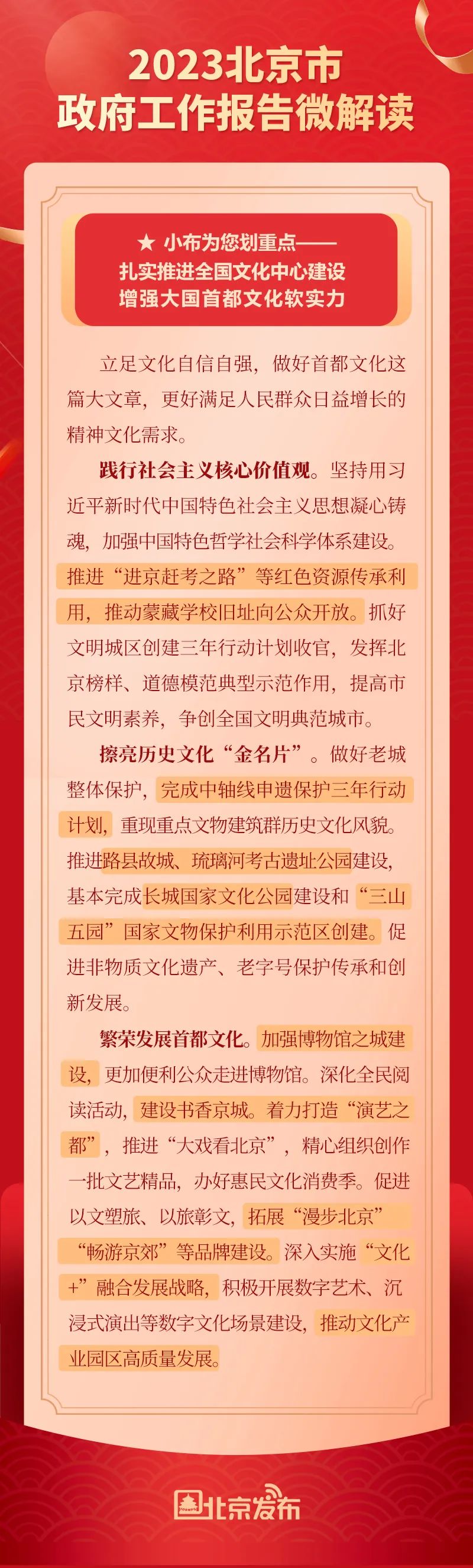报告中,部署了2023年北京市十二个方面的重点任务,其中提出“扎实推进全国文化中心建设,增强大国首都文化软实力”。今年北京将如何推进全国文化中心建设?一起来看——