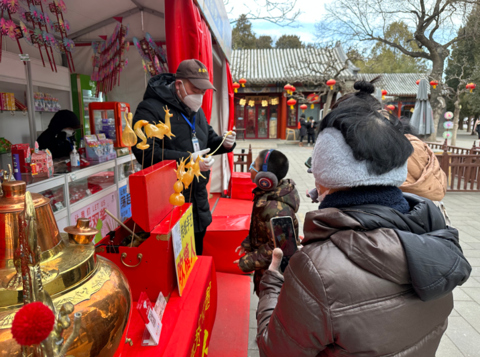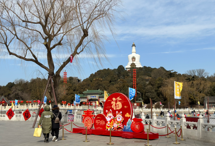 春节期间的北海公园里热闹非凡,蓝天白塔红灯笼背景里拍照打卡、玩冰场体验冰嬉乐趣、买文创领春节折页、观展览古建……游客游园过年很开心。