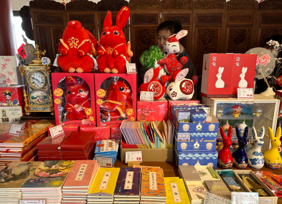走进北海公园的各个文创商店里,游客可以免费领取春节限定的文创折页,了解春节传统习俗。冰场南侧的文创店,儿时玩的四轮、六轮风车一个挨一个地挂着,风一吹就发出“咯咯咯”的声音,瞬间把人拉回拿着风车在胡同里跑的童年时光。御绣缘文创店中,兔儿爷、兔团团毛绒玩具、瓷兔、冰箱贴、盲盒……琳琅满目的兔年文创产品被摆在了最显眼的位置。一款小兔子送元宝,祝福“恭喜发财”的冰箱贴吸引了游客的目光。“每到大年初五,按照习俗迎财神,买这个冰箱贴,应景儿。”一位游客说。