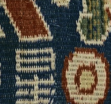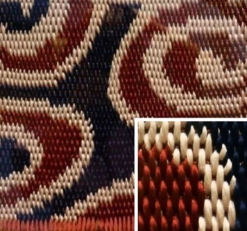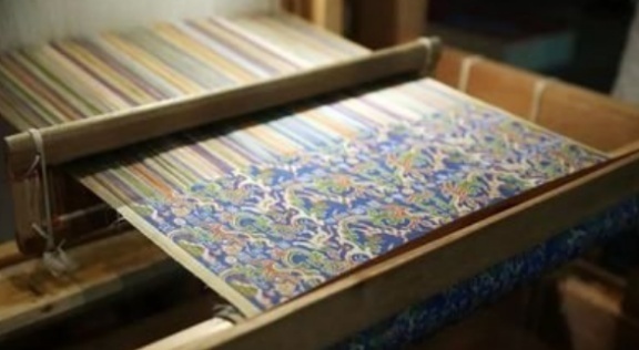 “五星出东方利中国”织锦护臂,于1995年出土于新疆和田地区的尼雅遗址,长18.5厘米,宽12.5厘米,上有八个篆体汉字:“五星出东方利中国”,历经千年,色彩依旧艳丽如初。“五星出东方利中国”织锦护臂蕴含了千年前丰富且珍贵的历史、人文、艺术、美学等信息:织锦上“五星”“中国”的篆体汉字、寓意祥瑞的古代天文星象学、珍奇瑞兽的古老图腾,更有精美绝伦,价值极高的织锦织造技艺,经过纺织考古专家分析和鉴定,判定其是由五组经线和一组纬线织成的五重平纹经锦,不论是花纹色彩,还是织造工艺都达到了登峰造极的地步。在这样高超丝织技术的背后,我们不仅看到了古代先人们的智慧,还有千年前人们对于美好幸福生活的期盼和向往,一丝一线间,织出的不仅仅是织物,同时也是在编制一个对于美好幸福的梦想,而这个梦想一编就是几千年。