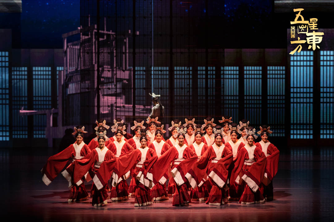 舞剧《五星出东方》由中共北京市委宣传部、中共新疆维吾尔自治区党委宣传部出品,北京演艺集团联合北京市援疆和田指挥部、和田地委宣传部共同制作,北京歌剧舞剧院、新疆新玉歌舞团演出。该剧以新疆和田尼雅遗址出土的“五星出东方利中国”织锦护臂为题材,讲述了汉朝戍边将领奉在精绝古城与北人首领之子建特、精绝首领之女春君之间,从剑拔弩张到并肩携手、从素不相识到深深认同,结下深厚情谊的动人故事,诠释了各族人民“像石榴籽一样紧紧抱在一起”,结成中华民族命运共同体的主题。该剧前不久刚刚荣获第十六届精神文明建设“五个一工程”奖和第十七届文华大奖,并即将于2月17—19日在北京天桥艺术中心开展获奖后的首次演出,后续还将进行全国约50到100场的全国巡演。