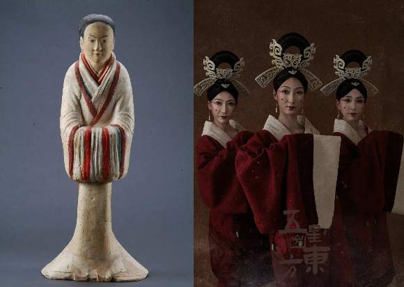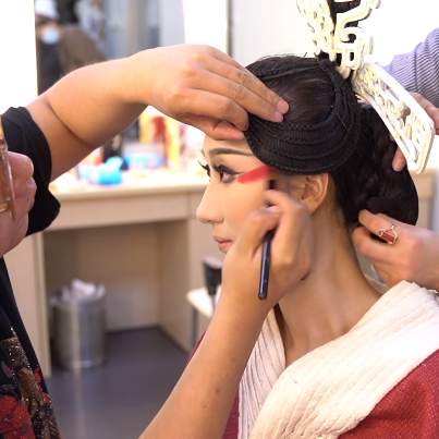 舞者造型和化妆上也是以汉时期审美为出发点,头饰设计为汉白玉质感纹样的造型,庄重而典雅,面部是极具汉时期代表性的妆容“长眉红妆”。大面积运用朱红色铺满眼下及脸颊,隆重且极具氛围感,“长眉入鬓”,充分展现女子的婉约舒美,同时,汉代的唇妆以小口为美,上窄下宽,圆润流畅,形如倒扣的樱桃,深度还原汉时期的文化审美。