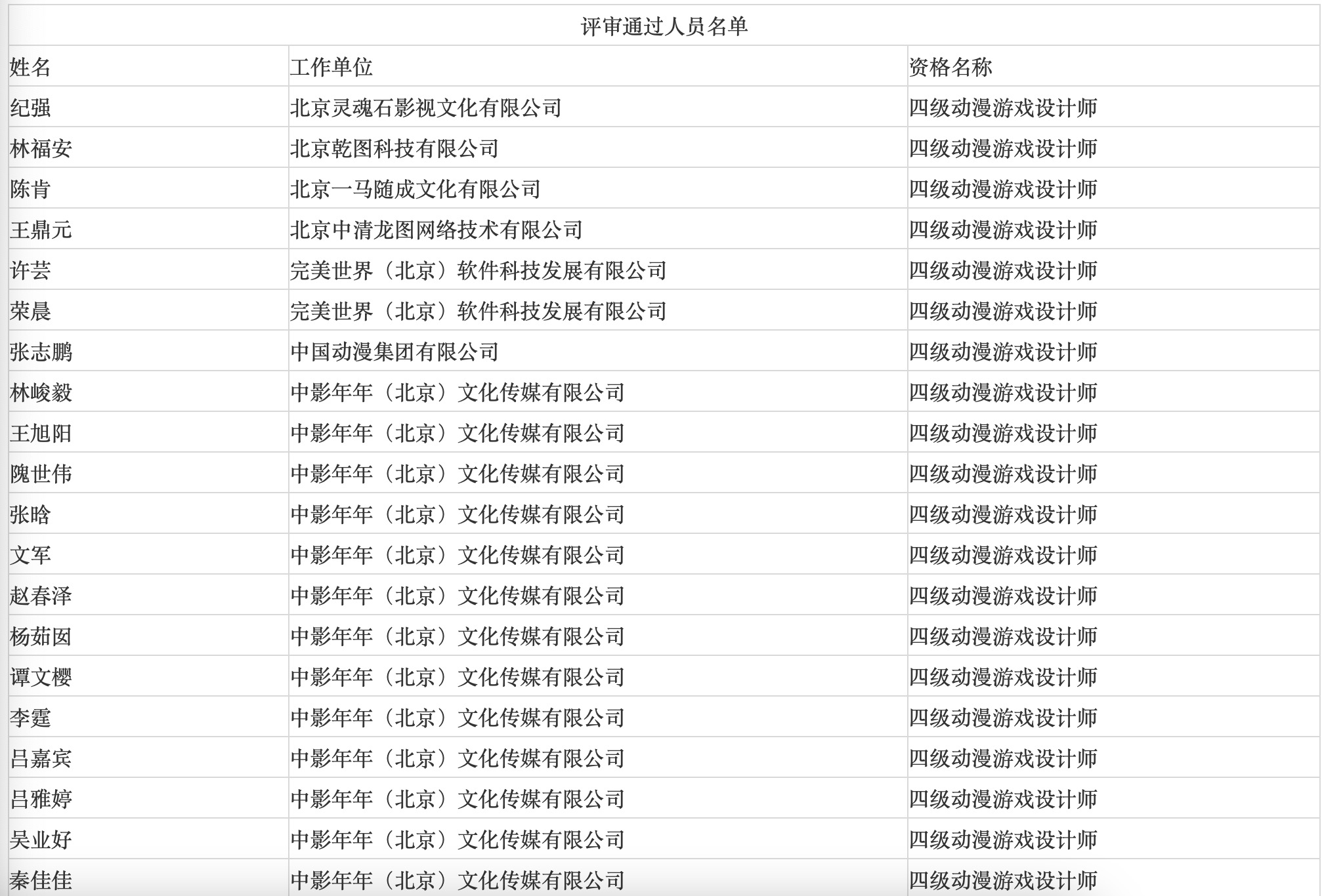 北京市艺术系列(动漫游戏)初级专业技术资格评审委员会于2022年11月4日召开会议,纪强等23人(名单附后)通过了四级动漫游戏设计师专业技术资格评审。根据《关于深化职称改革试行社会化职称评审的意见》(京人发〔2003〕49号)的规定,经复核,现予以公示。