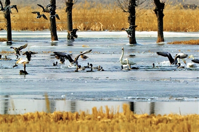 连日来,在老哈河通辽市奈曼旗段,数万只天鹅、绿头鸭、赤嘴潜鸭在消融过半的水面上嬉戏、游玩、觅食,与清澈的河水勾勒出一幅人与自然和谐共生的生态画卷。