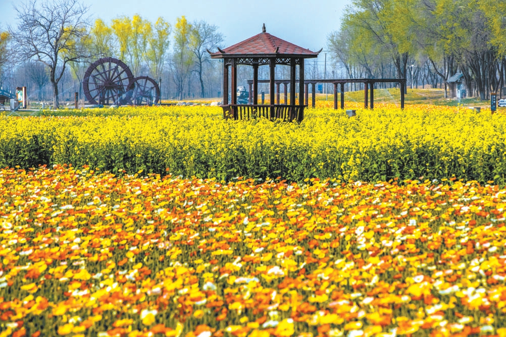 永定河畔的紫谷伊甸园里,百亩花海随风起浪,冰岛虞美人、油菜花等绚烂绽放。本报记者 刘平摄