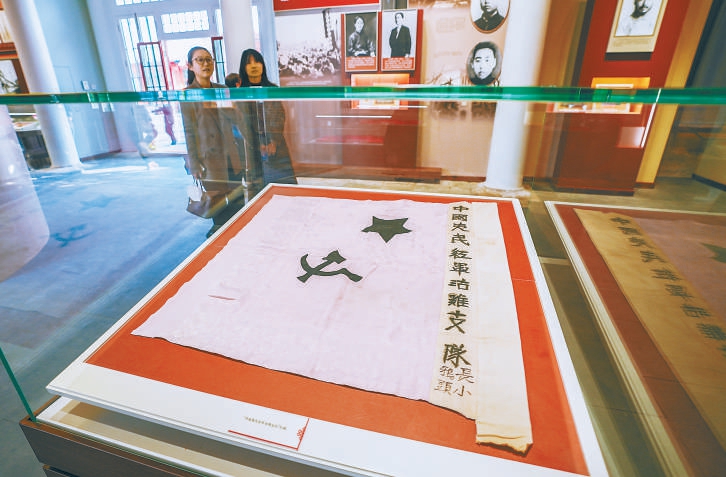 “中华一脉 同心筑梦”主题展里,一面手工缝制的队旗被单独陈列在一个展柜里。80多年的岁月褪去了队旗原本显眼的红色,在缎面上留下斑驳的痕迹。旗子上绣着一颗五角星,下面是中国共产党党徽。这面队旗,讲述了一段动人的革命情谊。