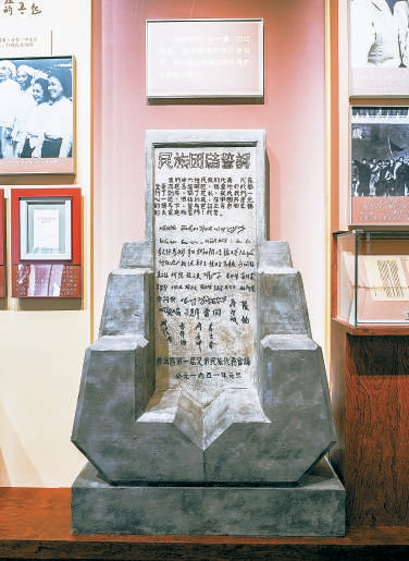 1956年,毛泽东在《论十大关系》中强调,要搞好汉族和少数民族的关系。为了加强民族联系、打破民族隔阂,经毛泽东提议,派遣中央民族访问团深入民族地区,宣传民族政策。展厅里,有很多各民族团结友谊的见证物。一块上世纪50年代云南省普洱专区26个民族代表立下的“民族团结誓词碑”,就是在听取了进京参观团的介绍,了解了全国各民族团结、祖国建设蒸蒸日上的情况后,普洱专区各民族代表一起盟誓“在中国共产党的领导下,为建设平等自由幸福的大家庭而奋斗”。这也被誉为“新中国民族团结第一碑”。