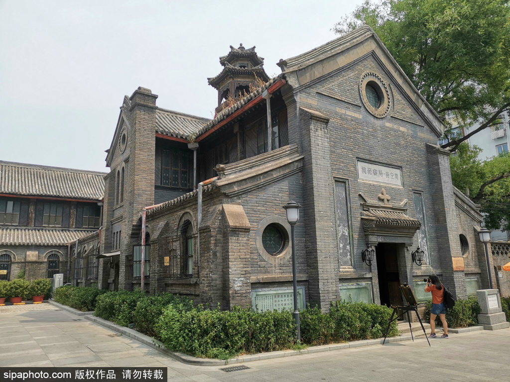 该教堂建于1907年,由英国人史嘉乐主持建造,是基督教中华圣公会在华北地区建设最早的中心教堂。教堂坐北朝南,平面为拉丁十字形,从侧面能看到顶部有两座八角亭作为天窗和钟楼,立面门窗为仿哥特式,别有一番风韵。