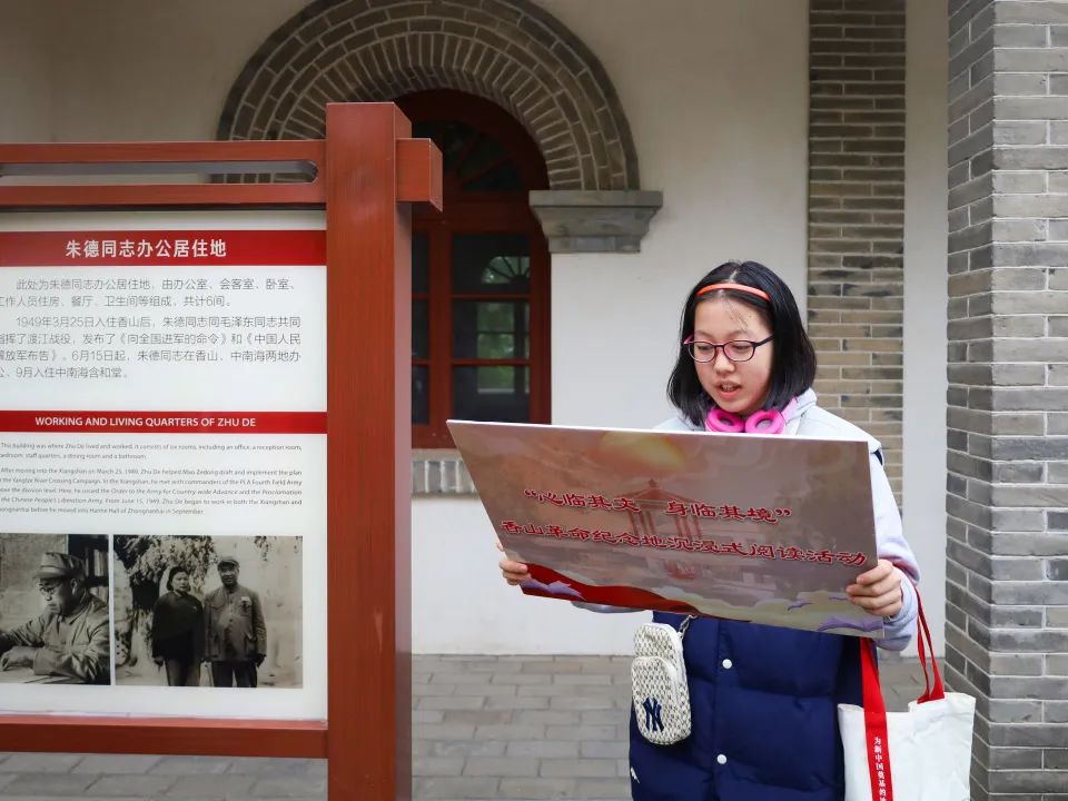 随着参观行进的路线,大家边聆听宣教员的介绍,边诵读着相关的内容,比如:毛主席和朱总司令发布的《向全国进军的命令》、毛主席与周总理写给宋庆龄先生的亲笔信、《刘少奇论新中国的经济建设》等文章和书籍的选段,通过这样的方式,更加深入的了解着毛主席和他的战友们1949年在香山工作的情况。