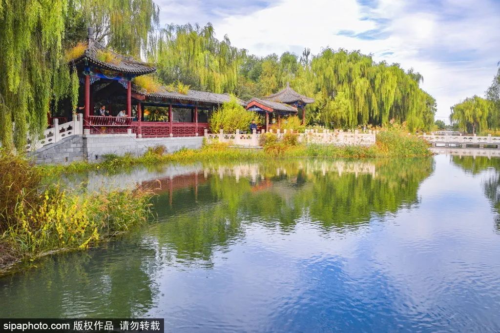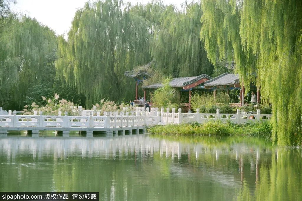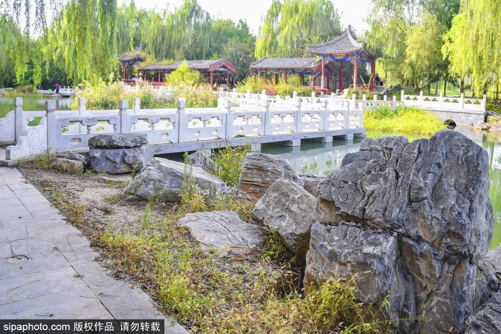 越往公园深处走,景色越纷繁精彩。公园沿着萧太后河而修,两岸林木繁茂,中央河水悠悠,并以多座拱桥贯通两岸,栈道旁边还有大片芦苇。