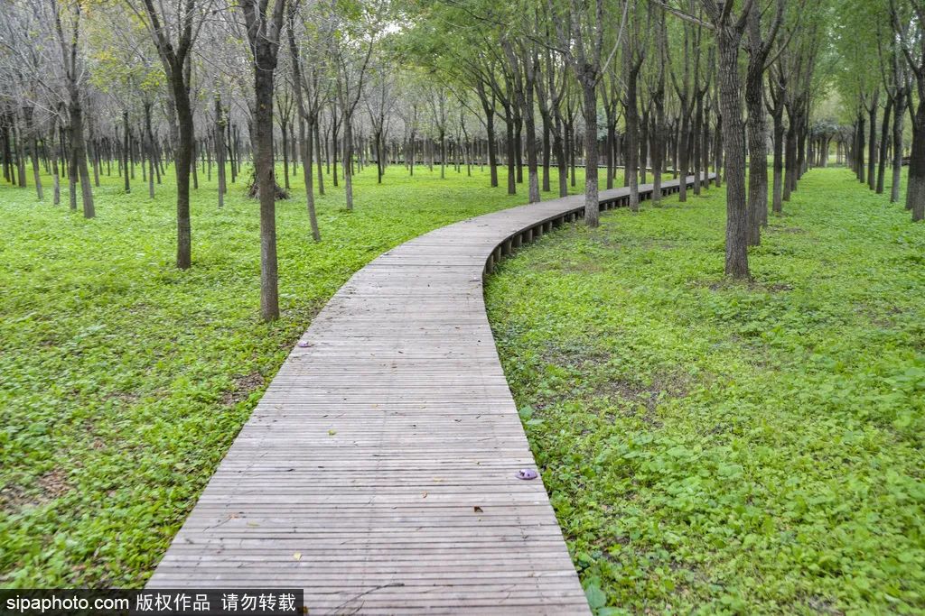 景观中纵横交错,贴近水面的古朴木栈道既方便游客近距离欣赏水生植物,又可感受到溪流潺潺、芦苇丛丛的意境。