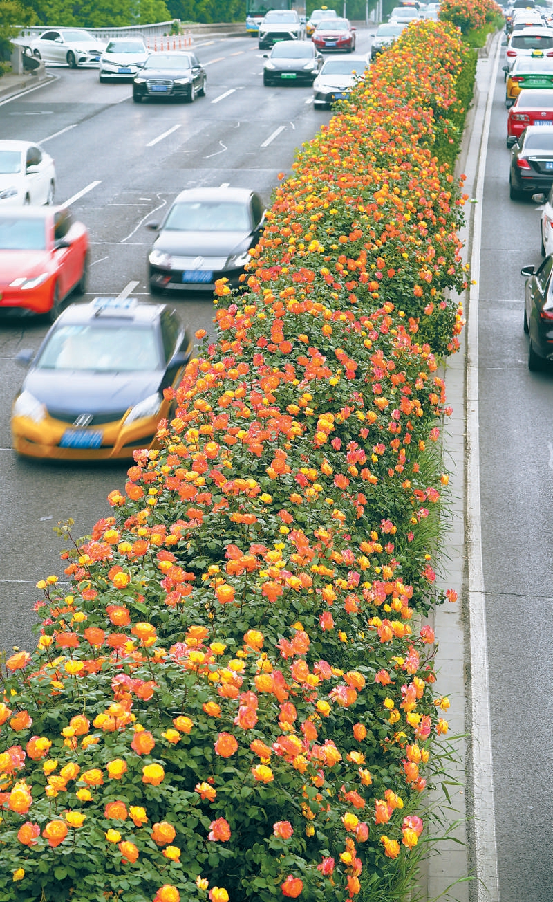 5月,月季盛开。京城二、三环路的行车隔离带,被月季花装点成五彩大道,犹如给城市戴上了五彩项链。 本报记者 刘平 摄