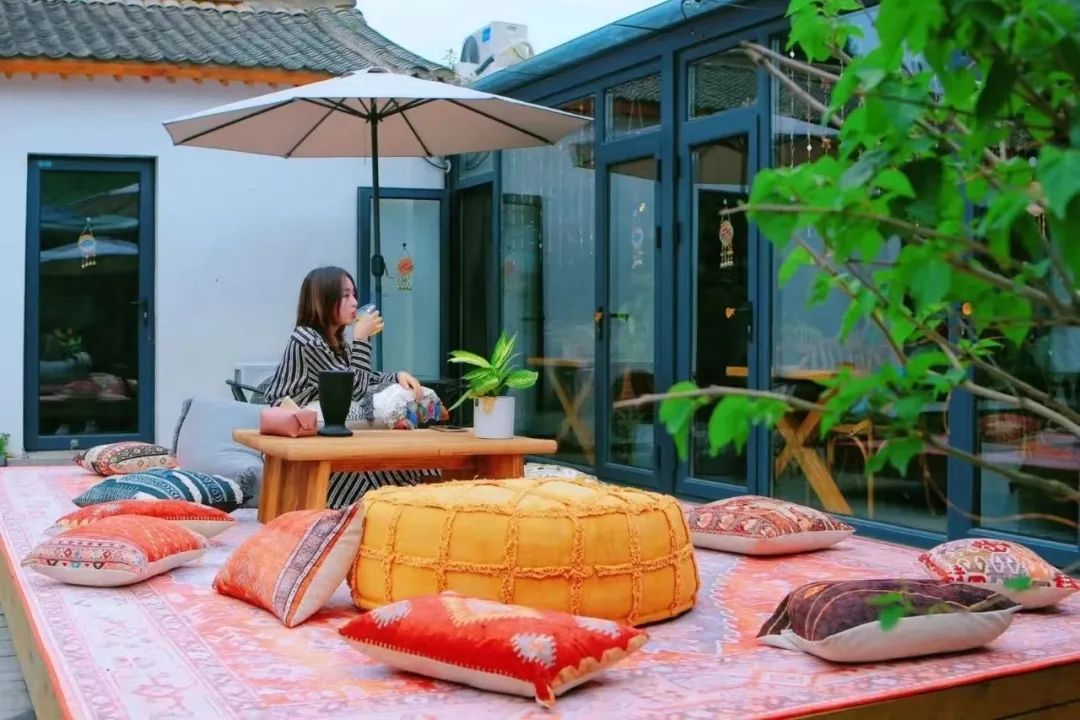 这是一处藏在大山深处的桃花源,院落古朴幽静、时尚闲雅。餐厅的屋顶、地面、墙面、窗边……都被葱郁的绿植占领,目光所及之处皆是生机勃勃的气象,浓浓的波西米亚风格,是文艺青年的最爱,在这样的餐厅里享受美食,大概就是诗与远方中的情景吧。