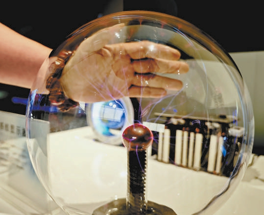 首钢园中关村科幻产业创新中心的科幻产业新技术新产品展上,神奇的闪电球引来众多观众体验。