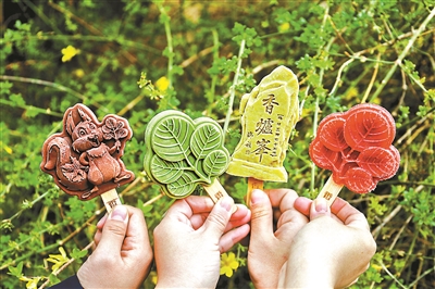 香山公园推出四款文创雪糕,可谓“有颜、有料、有内涵”。其中两款是以香山红叶最具标志性的黄栌树叶为造型,分为抹茶和山楂两种口味,一绿一红,代表着春天和秋天黄栌树叶呈现出的不同状态。另外两款文创雪糕,则以香山小松鼠和香炉峰大石为造型,分为巧克力和绿豆两种味道。在香山公园内,随处可见游客手举文创雪糕“打卡”拍照。特别是游客登顶香炉峰时,手持文创雪糕与真正的大石合影,更成为登顶香山的全新“打卡”方式。
