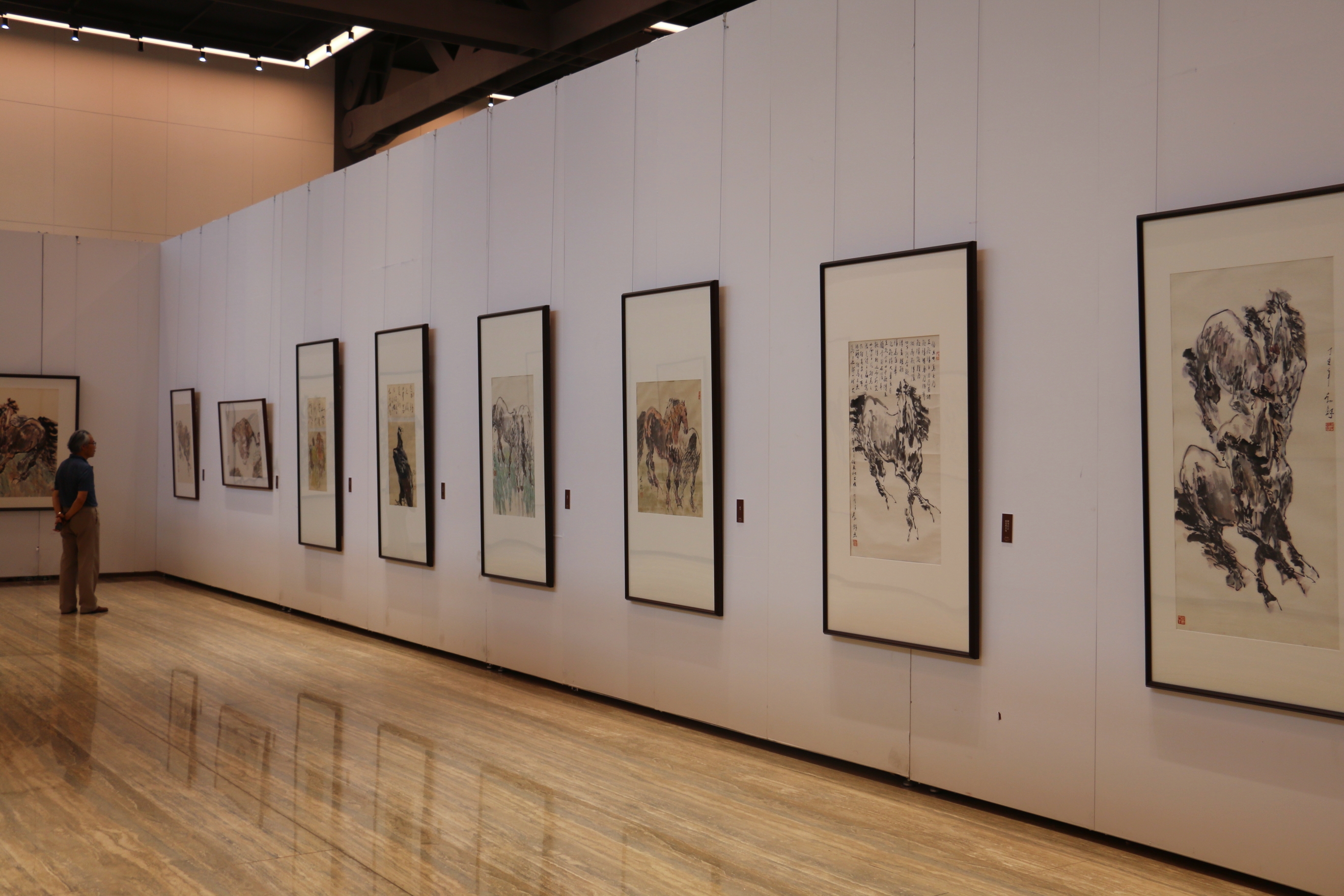 展览现场,展出了《大青山上的骑兵》《下乡图》《朱德与白求恩》等反映重大历史题材和生产建设的绘画作品,其中不少也融入了马的形象。作为徐悲鸿的学生,刘勃舒并未盲目模仿徐先生的画风,而是大胆地在笔墨技法、构图造型和艺术境界等方面进行变革与突破,他不断在现实生活中获取素材,遵从先生“以造化为师”的教导,成为继徐悲鸿先生之后的画马名家。