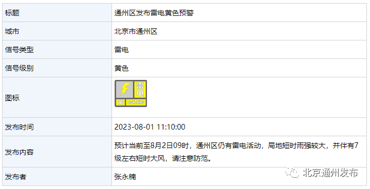预计当前至8月2日9时,通州区仍有雷电活动,局地短时雨强较大,并伴有7级左右短时大风,请注意防范。