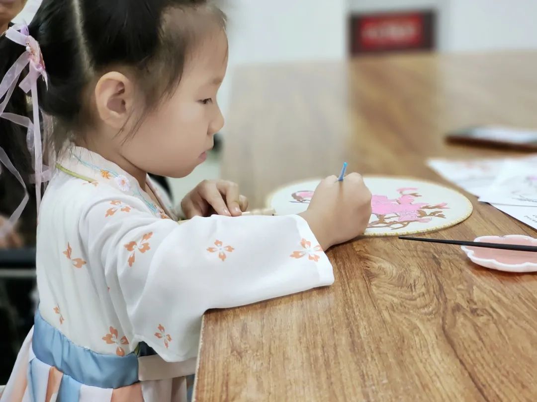 在中国的文化中,圆形的团扇包含着天人合一、团圆美满的美好愿望,因而受到人们的广泛接受和喜爱。后来,团扇逐渐演化出了椭圆、六角、梅花等形状,但一直保持了圆润的线条、轻盈的质地、美丽的图画,因而一直代表着人们心目中那些最美好的事物。在现场老师的指导下,孩子们利用空白扇面、各种绘制工具,着手绘制各自独具一格的精美团扇。