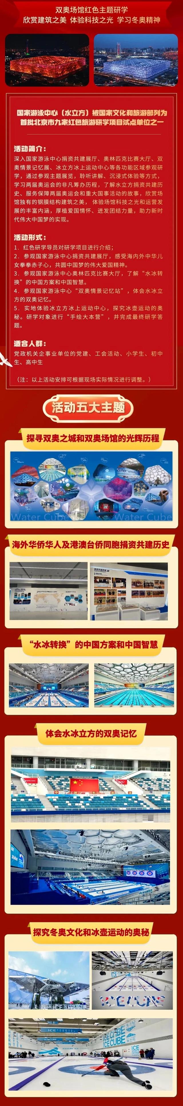 近日,国家游泳中心正式被文化和旅游部列入红色旅游研学试点单位,成为可复制可推广的红色研学“北京样本”和爱国主义教育基地全国示范样板。
