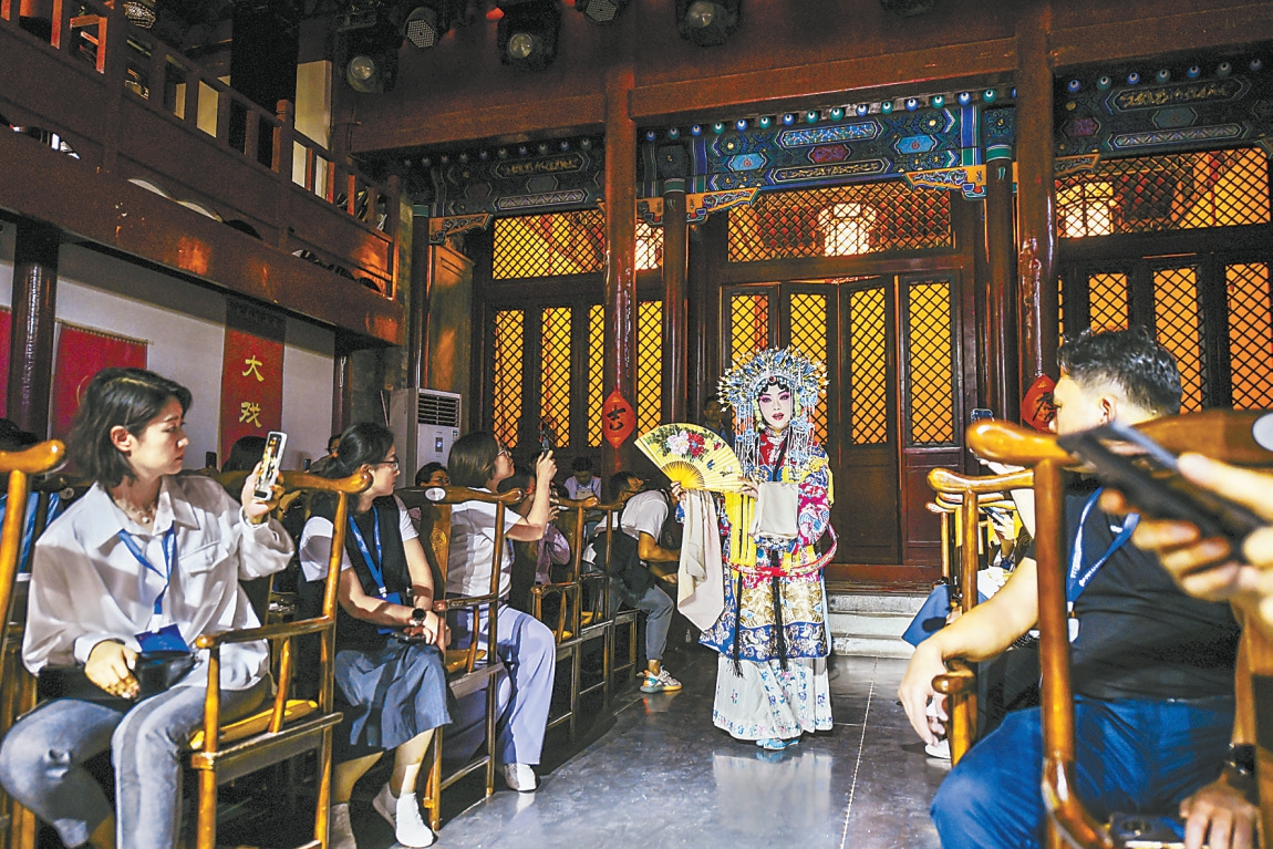 从前门步行街向东,三里河公园是藏于闹市里的一隅静谧之地。时值初秋,碧水悠悠,满目葱茏,大家沿着河畔漫步,采风拍照,感受古都魅力。在三里河公园东北角,有着400余年历史的颜料会馆,上演了一场经典的“会馆有戏”演出。兼具力量与美感的中国鼓表演《鼓舞飞扬》气势恢宏,京剧《贵妃醉酒》选段唱腔悠扬,民乐三重奏《春江花月夜》旋律细腻婉转。精彩表演引得参观者频频鼓掌。