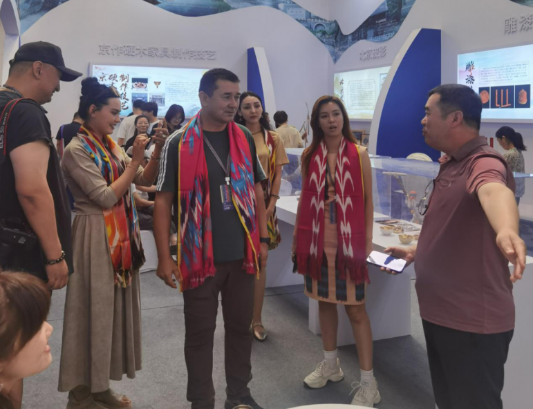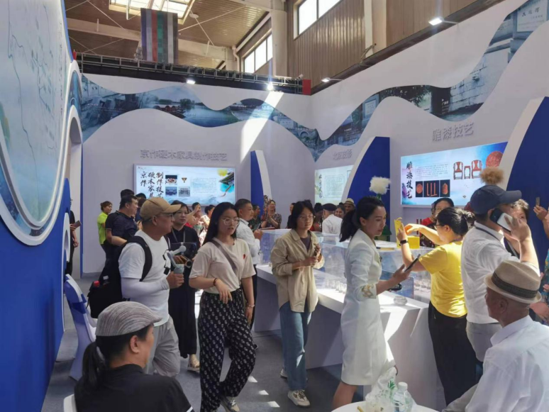 今年北京展区以蜿蜒曲折的大运河为设计主题,节选北京段大运河沿线点睛历史遗迹及非遗项目,整体造型简约灵动,充满年轻气息与活力,与阿克苏展区遥相呼应,形成了大运河流域与新疆丝绸之路地带非遗文化的鲜明对比,吸引了各族同胞及学生前来了解、体验北京非遗。