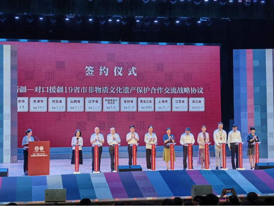 【北京旅游网报道】2023年8月23日-27日,文化和旅游部、新疆维吾尔自治区人民政府共同举办的2023“新疆是个好地方”对口援疆19省市非物质文化遗产展在阿克苏市成功举办。文化和旅游部党组成员、副部长饶权,新疆维吾尔自治区党委党的建设工作领导小组副组长田文出席开幕式,与各省市传承人代表共同启动本次非遗展。北京市文化和旅游局参加了开幕式,并与新疆维吾尔自治区文化和旅游厅签署了“非物质文化遗产保护合作交流战略协议”。