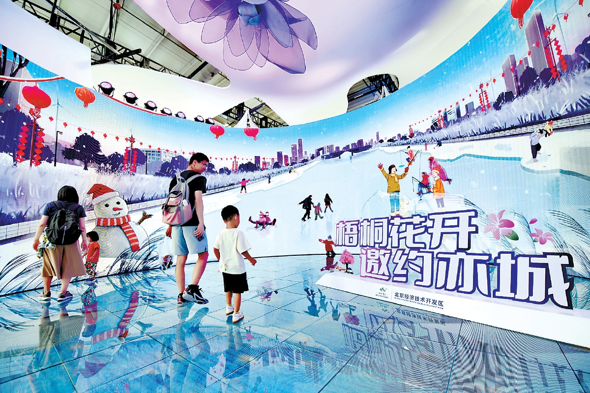 服贸会文旅服务专题展的北京亦庄展区内,沉浸式弧形屏幕展示“梧桐花开,邀约亦城”的美好场景。本报记者 和冠欣摄
