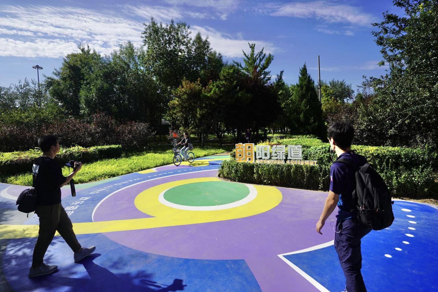 因为毗邻知名商圈和商务区,绿道极注重科技感、艺术感和生态体验感。朝阳区交通委相关负责人介绍,绿道中段已建成休憩点、驿站,还设有3D打印座椅等便民服务设施。沿线为健步者提供多功能拉伸景墙,环形港湾等健身设施。炎热的夏季,跑步爱好者还能享受到雾森降温廊架。绿道最大化满足中青年、老人、小孩的不同需求,如在望京沟海棠花溪段设置了“望月秋千”“字节乐园”“京趣沙坑”等休闲娱乐设施。