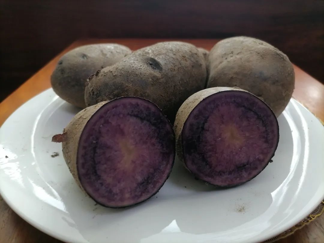 紫土豆是一种营养价值较高的食用农产品,最大特点是富含花青素,具有增强人体免疫力、延缓衰老、增强体质、抗癌、美容和防治高血压等多种保健作用。随着人们对健康饮食的需求越来越大,颇受广大消费者的喜爱。农场种植的“紫美人”,种植要求高、产量少、淀粉含量高、皮薄、质嫩,紫土豆肉质绵密细腻,掰一小撮在手中碾碎,不像一般土豆那么干,指尖会有细腻水润的感觉,丝毫没有颗粒感。