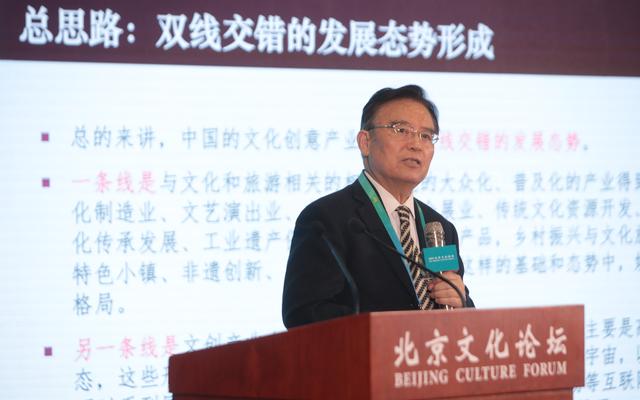 9月15日,中国人民大学教授、中国人民大学文化创意产业研究所所长金元浦在北京文化论坛平行论坛上作主题演讲。新京报记者 王嘉宁 摄