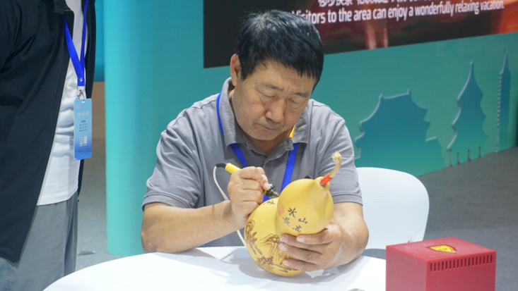 北京丝纶纺织股份有限公司的系列丝巾、手拎包、笔记本,北京吉祥八宝葫芦手工艺品专业合作社的火绘《生肖全家福》、“顺顺”小葫芦伴手礼等,将运河文化与古都非遗的内容有机融合。在现场,市级非遗“老北京火绘葫芦”代表性传承人牛成果展示火绘葫芦全过程,游客还可以亲自上手,体验非遗技艺的乐趣,给自己制作独一无二的伴手礼,新鲜的非遗体验吸引现场观众纷至沓来,开启“买买买”模式。