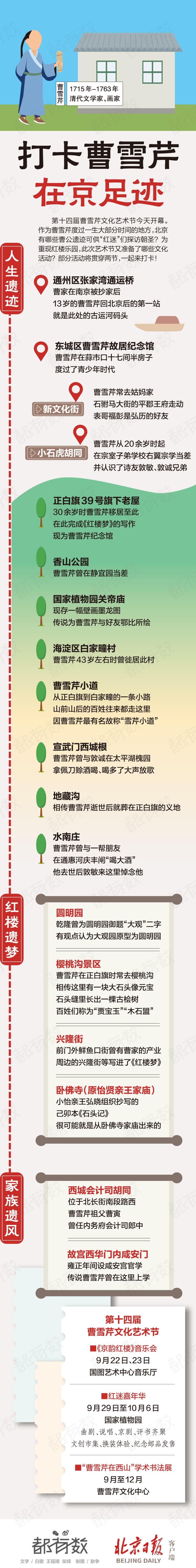第十四届曹雪芹文化艺术节9月22日开幕。作为曹雪芹度过一生大部分时间的地方,北京有哪些曹公遗迹,可供“红迷”们探访朝圣?为重现红楼乐园,此次艺术节又准备了哪些文化活动?部分活动将贯穿两节,一起来打卡!