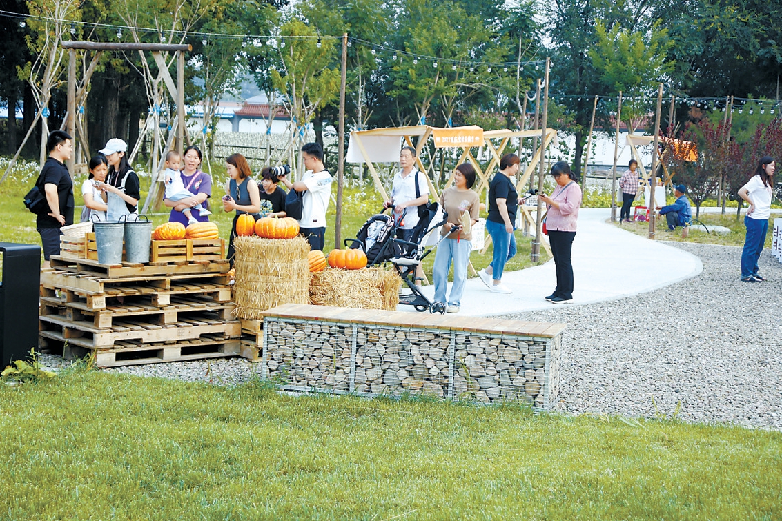 正是丰收的季节,乡亲们带来的山楂、苹果、红提和葡萄透着新鲜,还有网红咖啡车、啤酒车上琳琅满目的美食、文创产品。夜幕降临,人们赏月观星,看露天电影、吃烧烤、喝啤酒,十分惬意。