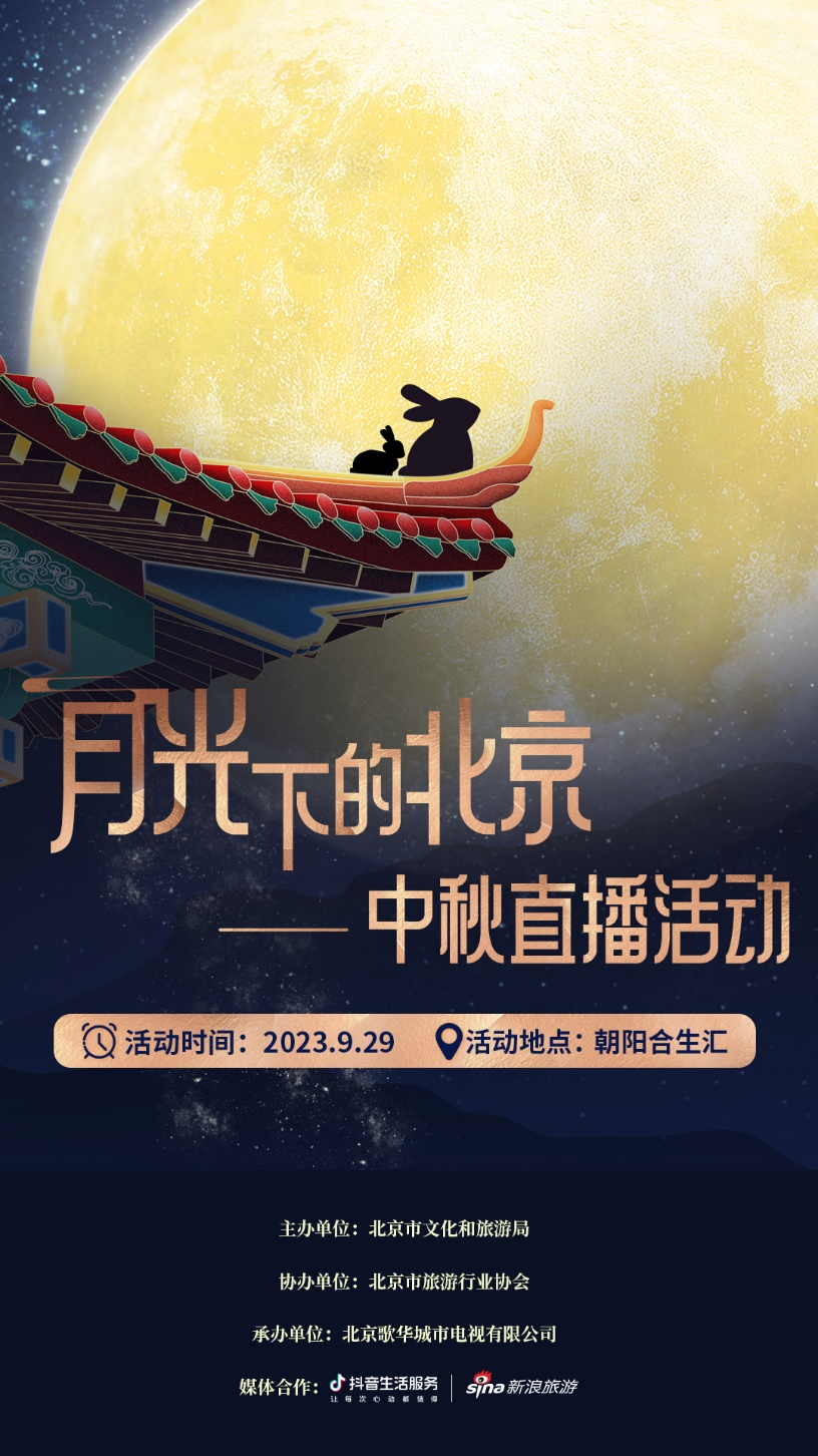北京市文化和旅游局联合北京歌华城市电视于9月29日中秋节晚8点在北京合生汇户外大屏广场前举办“月光下的北京”中秋直播活动。活动同步开启线上直播间,参与互动有机会赢取非遗兔爷、于小菓北京福饼、角楼咖啡等中秋好礼。